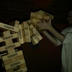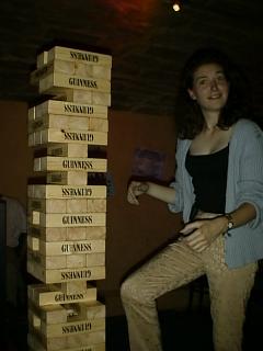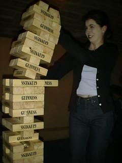 For those of you not familiar with this game, the idea is to remove blocks from the stack with one hand only, and put them on the top. The first one to topple the stack is the loser. The usual version is about a foot or so high - as you can see, this one is a bit more special!
