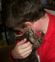 There is one little habit of his that Christian has warned me about - very endearing - it seems to be something to do with the fact that he was orphaned so young and therefore not breast fed. Basically, Scraps finds suckling on human earlobes very relaxing... it feels a bit odd at first, but the sound of contented slurping and purring right in your ear certainly brings out the maternal instincts in you.