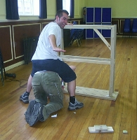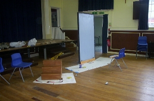Today we are in our other rehearsal venue - Tom the Director's mum is a headmistress so we are using her school's stage for construction of set and rehearsals. Today we are set building - we being Tom, Russell (crew) and Dave (cast). Paul, who wrote the play, joins us later in the day.